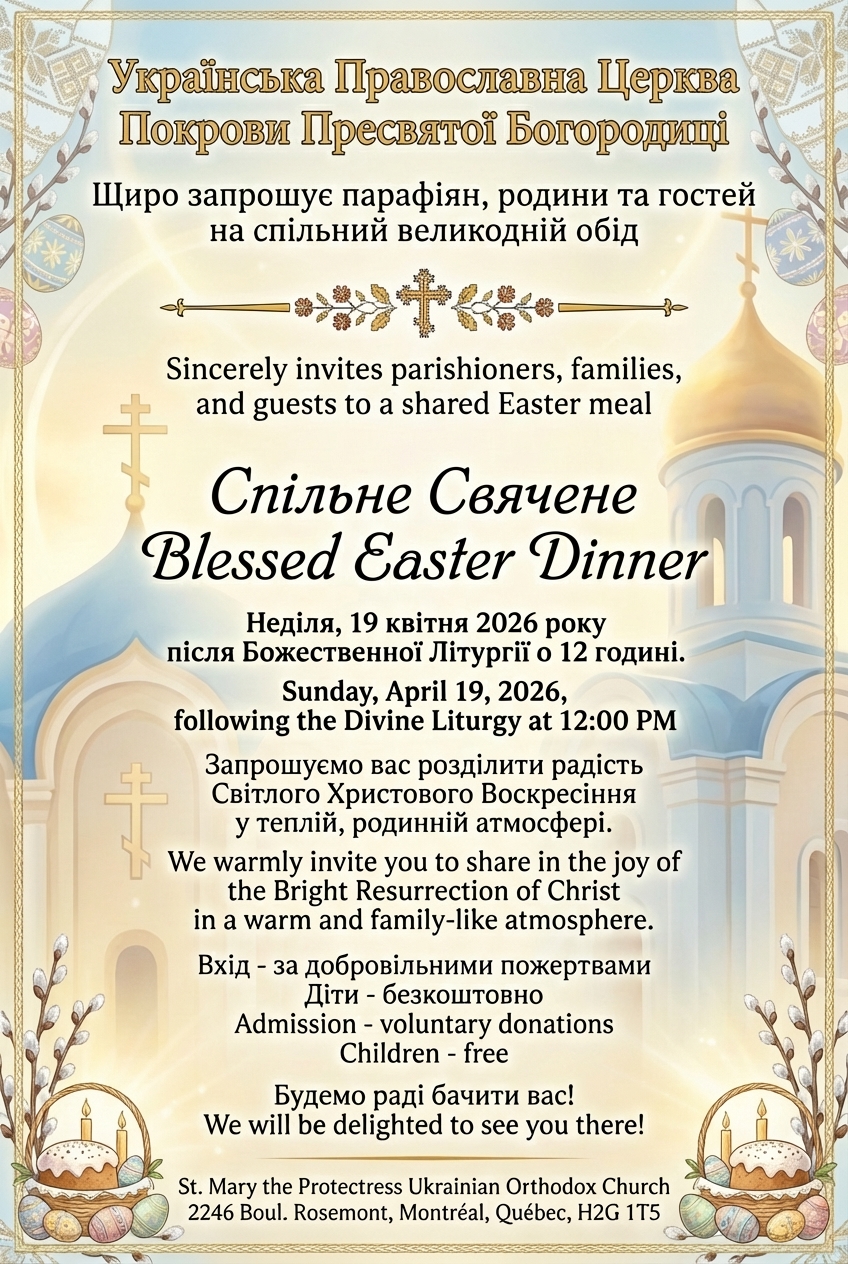 View Larger Image 2026 | Велике Христове Воскресіння Valeriy2026-04-15T01:09:22+00:00April 15th, 2026|Categories: Church life, News, Parish, Ukrainian Community|Tags: Church life, Community, News, Parish| Related Posts Пасхальне Послання Єпископату Української Православної Церкви Канади у 2026 році Божому Gallery Пасхальне Послання Єпископату Української Православної Церкви Канади у 2026 році Божому Вітання з Великим Христовим Воскресінням! Gallery Вітання з Великим Христовим Воскресінням! Слово до вірян: Від Голгофи – до Воскресіння Gallery Слово до вірян: Від Голгофи – до Воскресіння 19 квітня 2026 | Спільний Великодній обід | Запрошуємо Gallery 19 квітня 2026 | Спільний Великодній обід | Запрошуємо 2026 | Вербна неділя Gallery 2026 | Вербна неділя